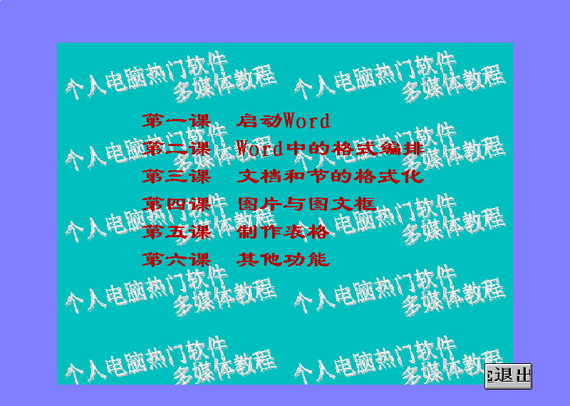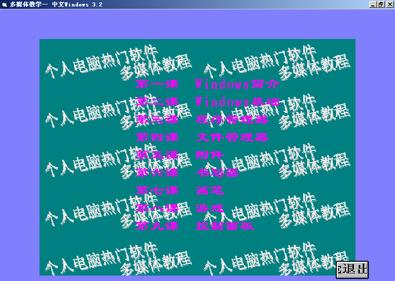 XP 虚拟机下建议使用 800*600 分辨率下运行本光盘是当时广大计算机用户使用最频繁的三个应用软件:中文 Windows 3.2、中文 Word 6.0(文字处理)、中文Excel 5.0(电子表格)的自学软件,目的是通过图、文、声、像等多种媒体形式,以丰富的图例循序渐进地在较短时间内教会用户使用和操作这三个软件。