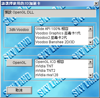 游戏支持显卡 3D 加速功能,如果不支持 3D 加速功能, 请执行 (开始->程序集->苍穹守护者->苍穹守护者-软件模式),如果计算机支持下列显示芯片, 请执行 (开始->程序集->苍穹守护者->苍穹守护者-3D加速卡模式)
