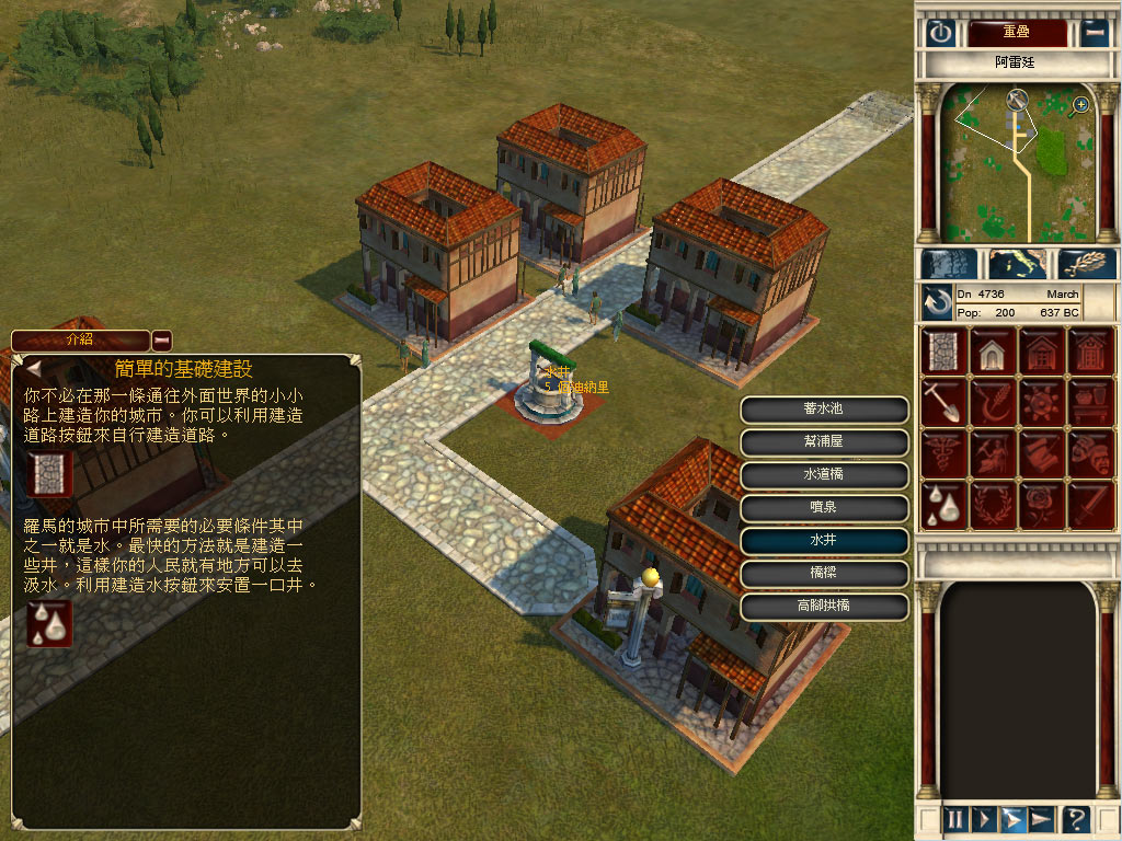 随着游戏的进行,玩家将逐步提升阶级,从地方行政官成为西泽大帝,这时候玩家将选择移动到古意大利其他地方发展。这部分可依据玩家的喜好来决定,玩家可以采取军事手段来征服邻近土地,建造军事单位生产投石器、步兵、骑兵以及弓箭手...等等武力来打击野蛮民族。