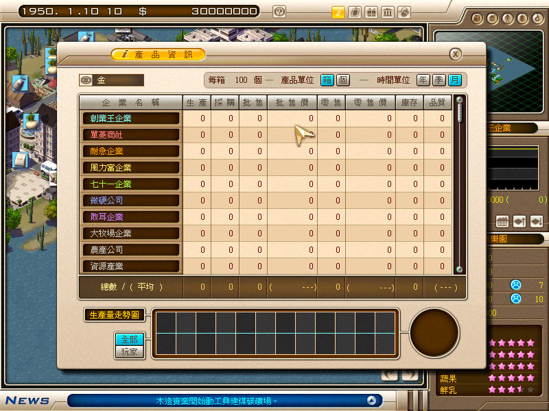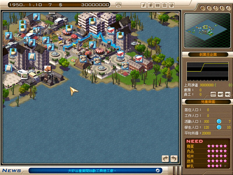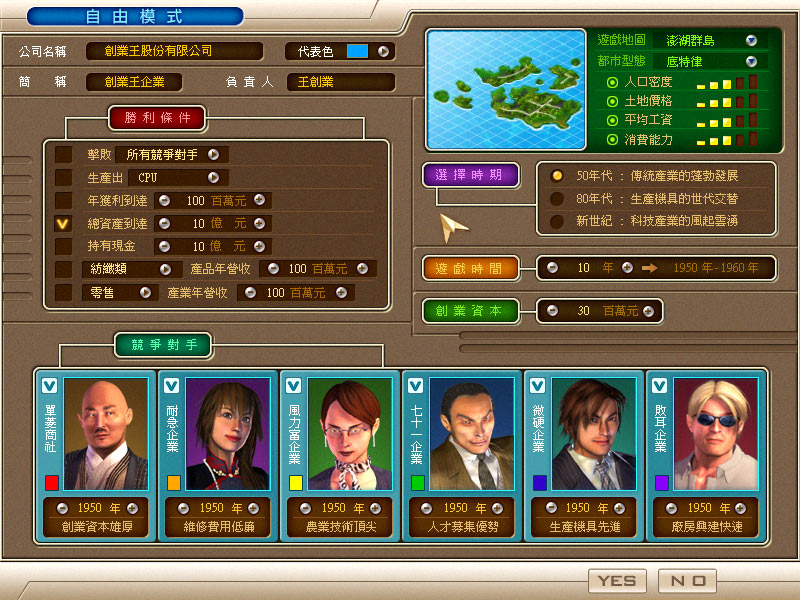 提供 1.02 升级补丁,以及破解文件在这经济不景气的年代,自己创业当老板难道真的只是一场梦吗?企业经营游戏「创业王」,将让玩家有机会一尝创业的宿愿!在这款高度拟真的游戏中,玩家将可以自选12大行业,权衡地利与价钱后买地设厂,依员工工作动线及各项生产设备来布置厂房,还要从数百种的原料组合出市场需求的商品,已是一个商业体系的完整缩影。玩家将体会从无到有、白手起家的创业过程,甚至在经过一连串激烈的商业竞争之后,挤身金融界巨子的行列,打造全新台湾奇迹。