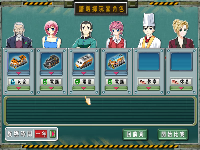 这次比赛参加者有地产大亨、饭店大亨、超商大亨、农产大亨、餐饮大亨、金融大亨等 6 人,由铁道公司提供一笔资金,让参赛者好好利用,发挥所长,并且善用火车运输赢得这场比赛。所以这是一套属于好玩又兼具地方特色的游戏。