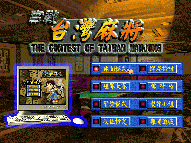 休闲模式:是一个十分自由的打牌模式。在这个模式中可以选择男、女共20位人物进行比赛。当设定好人物后,即可获得10万元的基本资金来进行游戏,本模式和冒险模式一样主要是培养选手,通过打麻将获得经验长级并领悟密技,直到达成1000万金额的目标。
