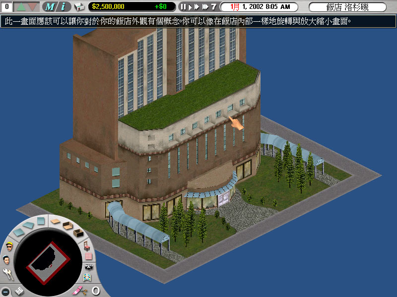 游戏开始时并不一定要选择选单内的预设旅馆,玩家可以从19种预设的旅馆类型中选择所想要的类型,一旦选定类型,饭店内的规划及布置就是玩家需要伤脑筋的重头戏,从一个有限的空间中,逐步规划出大厅、卧房、餐厅、健身房、游泳池等各种不同机能的空间配置,旅馆内各区域动线是否顺畅、空间位置关系等都会影响到将来消费的客人。