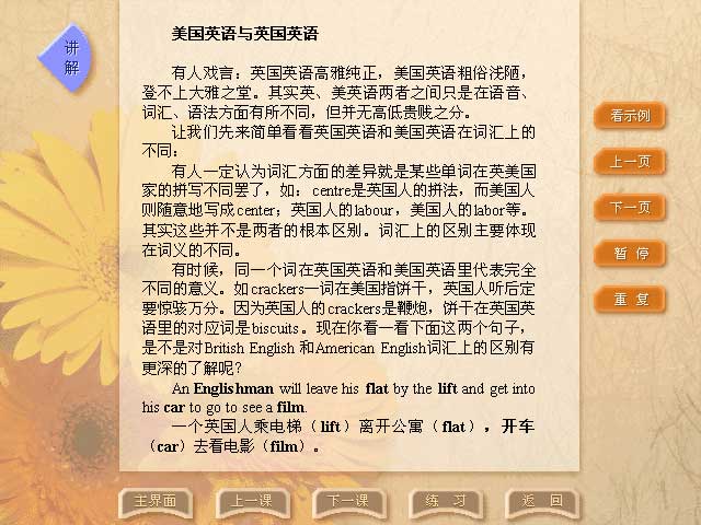 《随心所欲说英语Ⅱ》是洪恩公司在好评如潮的《随心所欲说英语》基础上倾力开发的一套全新理念多媒体的英语口语学习软件。所有句子全部由外教朗读配音,符合美国人口语习惯和部分英式说法。应用领先世界一步的语音识别技术。不仅可以对用户说出的整句话进行评分,而且能指出该句中具体哪些词发音不准,需要重点注意,使得在学习过程中做到有的放矢,倍感轻松,在不知不觉中能很快流利地说讲英语。