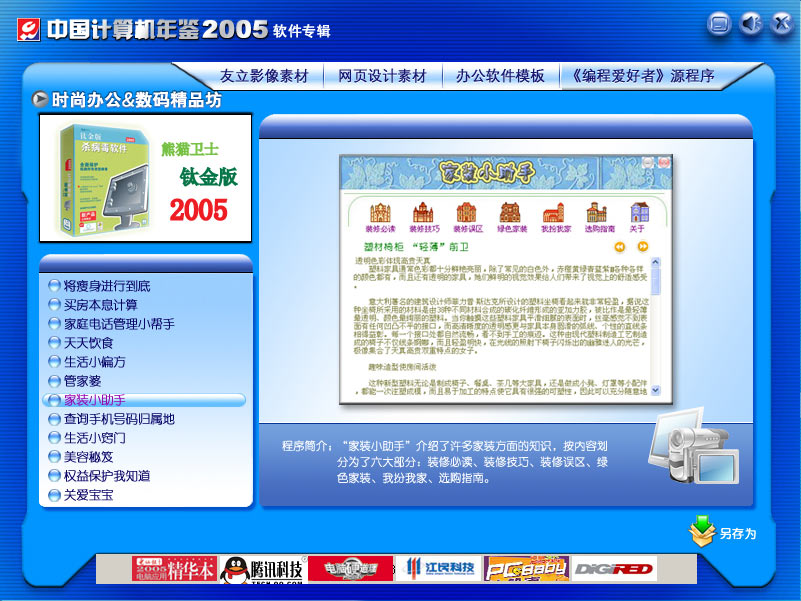 《中国计算机年鉴 2005》(软件专辑)中收录了由各大著名 IT 厂商友情提供的超值新年大礼包,30 款年度流行装机必备软件,囊括了“2006 热门应用互动教程”、“2006 经典装机软件风云榜”、“2006 年微软增值大礼包”、“腾讯QQ官方资源大派送”、“2006 时尚办公&数码精品坊”、“2006 极品安全软件特区”、“2006 手机个性资源大搜捕”、“读者增值特惠专区”八大功能版块的内容。