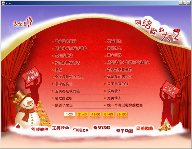 收录 100 首经典的网络歌曲,一首首美妙的歌曲,一段段美丽的爱情故事!