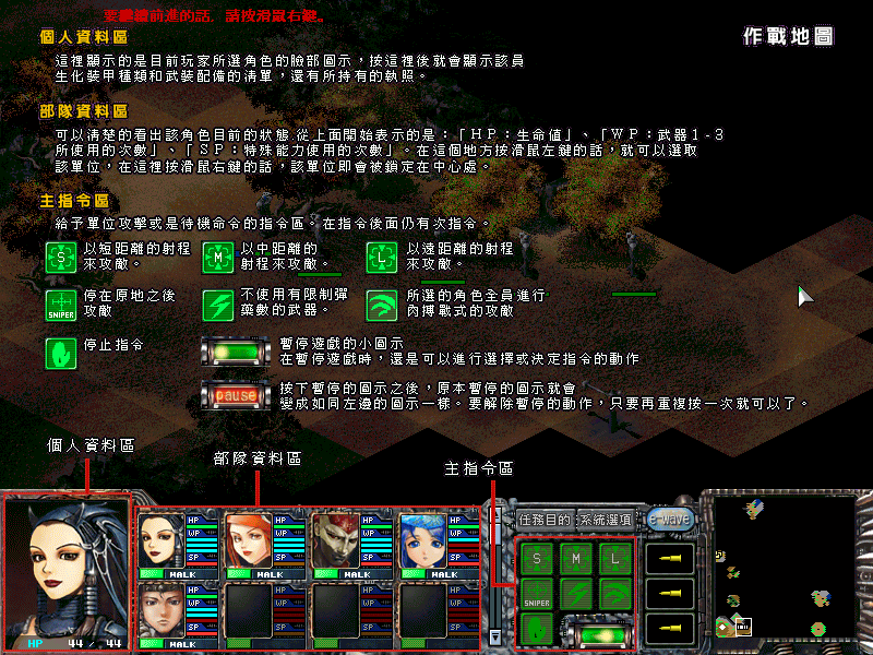 每名佣兵都有 6 项战斗属性:力量、灵敏度、命中率、防御力、战斗力和行动力。要提升这 6 样属性可以对佣兵进行药物强化。不过要获得强化的资格还是要由战斗经验来决定。玩家完全能把这个系统当作升级系统来看待。在经验获得到一定程度后,还能在佣兵学校里获得"执照"。这些执照能提升佣兵特定的战斗能力,十分有用,建议每个玩家冲关时给每个佣兵都弄一个。