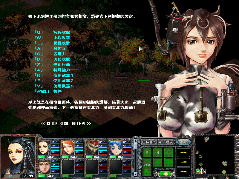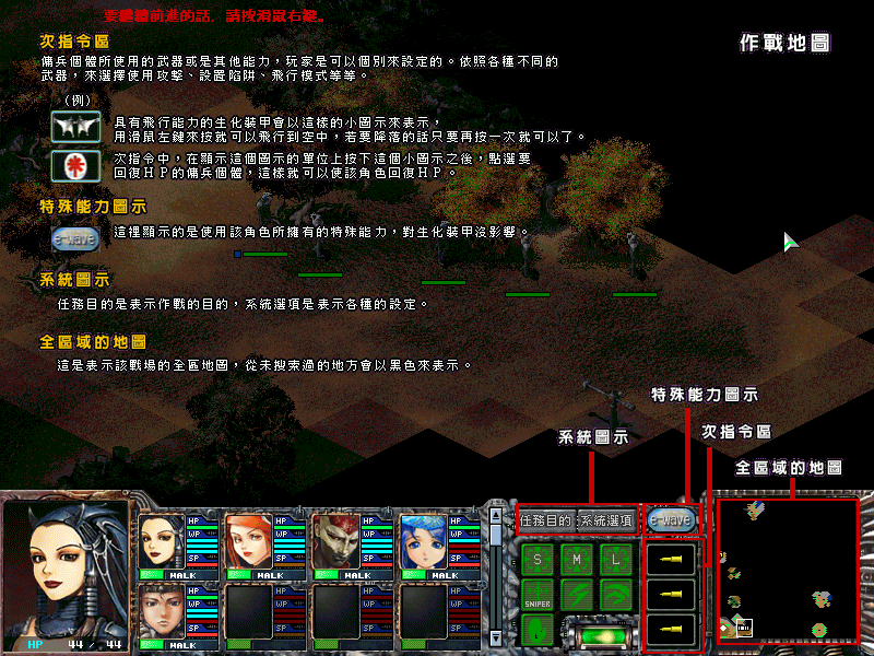 在战斗中,以肉身迎击对手的钢铁洪流是不现实的,佣兵们必须借助生化装甲的帮助。生化装甲也分成3个等级。一开始佣兵只能拥有最初级的装甲,但随着研究资金的投入,能研发出其他的高等级生化装甲。高级的生化装甲还可能拥有特殊的能力,譬如飞行。飞行兵种的出现到是让最终的战斗格局显得立体感十足。令人高兴的是,由于这个非常基本的设定,只要熬过最初的一段时间,每个玩家都能组合出适合自己战术的部队。