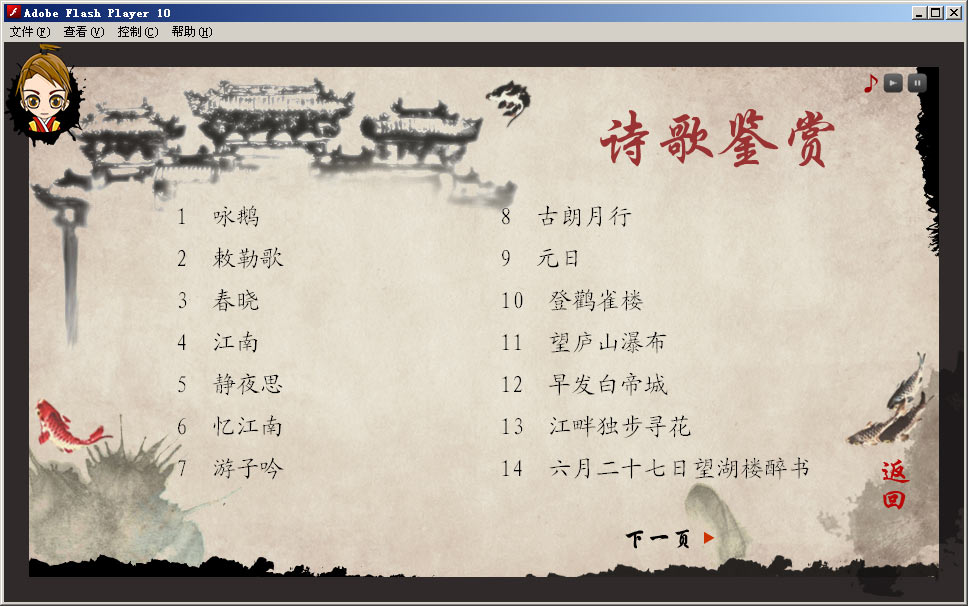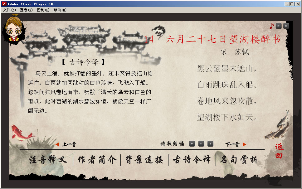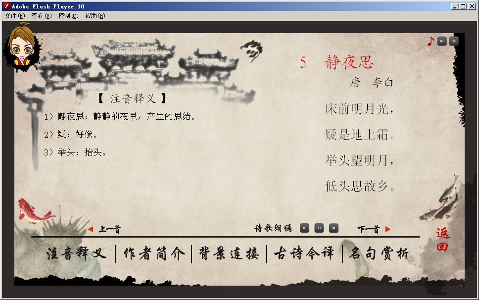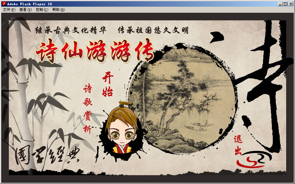 基于 Flash 技术开发的教育游戏,分别为游戏部分和诗歌赏析部分。游戏部分,游戏为 RPG 性质,需完成解谜任务,操作需要键盘和鼠标配合,略显不便。游戏可随意选择场景和关卡。诗歌赏析部分,包含 400 多首诗歌的注音释义、古诗今译、名句赏析等,普通话朗读。
