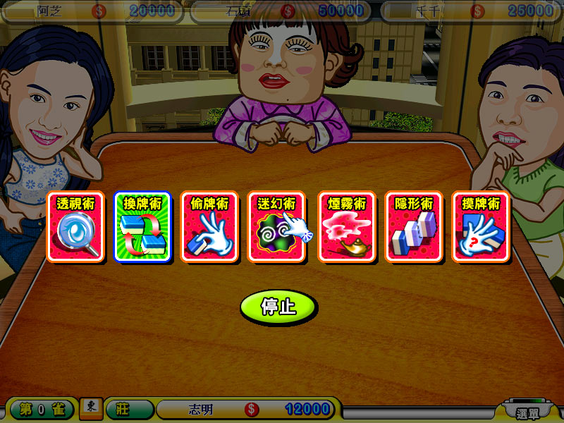 全部与巨星麻将馆相同,但可使用千术。首先牌局开始时,玩家将随机获得 2 种千术,胡牌时也会随机获得1种千术,自摸时则可随机获得 2 种千术。最多可有 10 个千术,满了后便无法再增加。以下为各千术的说明:
