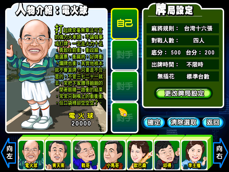 帕米尔信息 2004 年出品的麻将游戏,为《至尊麻将 2 麻将铁公鸡》的续集,共提供台湾 16 张麻将、台湾南部无花 16 张麻将、香港 13 张麻将、日本 13 张麻将等四种打法规则。游戏全部有 16 位人物供挑战,主要以台湾政治人物为主,再加上几位名嘴、艺人。而打牌方面,同样承袭该公司麻将巨星以来一贯高水平的计算机 AI 与打牌流畅度,因此有一定的娱乐性。游戏里区分了可用千术的麻将玩透透,以及不可使用千术的谁是铁公鸡,让玩家进行麻将赛挑战;也提供了一些小游戏供玩家消遣,功能相当地齐全。唯一可惜之处是,人物的配音模仿度不算高,常会搞不清是那一位在说话。但这并不妨碍到本游戏的娱乐性,仍算是值得一玩的游戏。