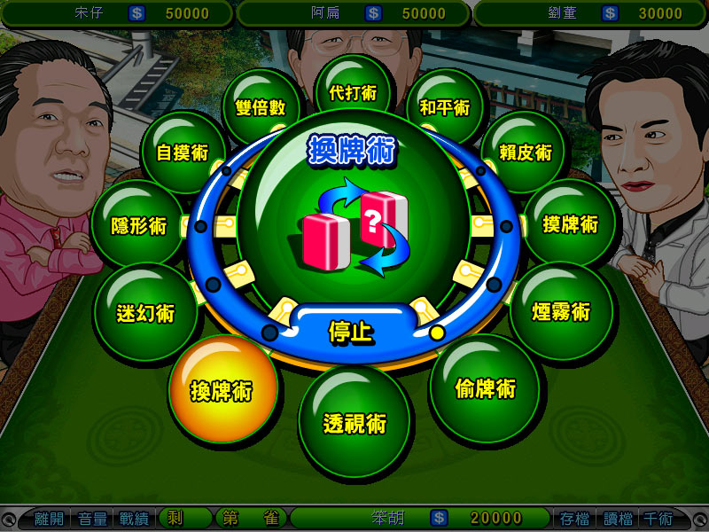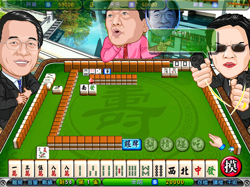 眼牌:必须在摸牌之前按下浮动按钮“眼牌”,此时计算机会自动翻开各家手中的牌,然后自动摸牌打牌,直到有人胡牌或和局。(台湾16张麻将规则)