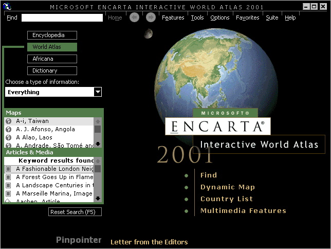 Microsoft Encarta Reference Suite 2001 将帮助您查找和组织近 25 万篇文章中的信息,包括全面的文本、图片、声音(甚至是发音)和视频。这不仅仅是一本百科全书,该套装还包含时间表、世界英语词典、同义词词典、语录、风格手册、2001 年年历、以及交互式世界地图集等海量信息。