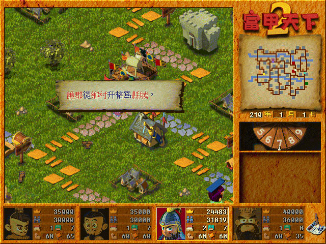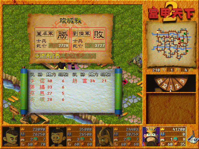 5.友好度:决定计算机对手的态度,包括踏中城池是否选交战,或是是否对己方使用计谋。友好度太低的人物走到同一格,也会相互交战。