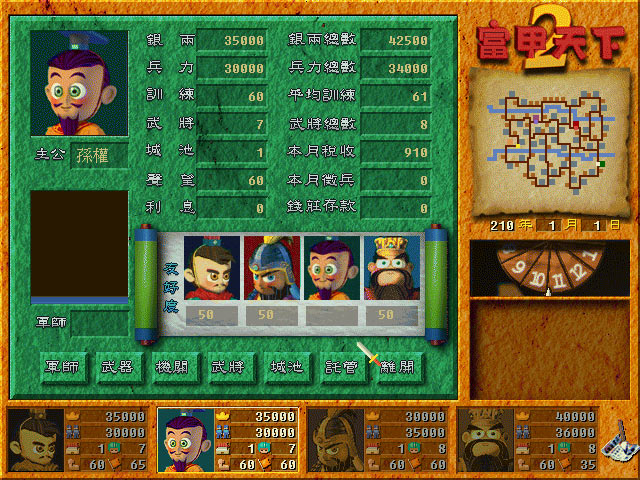 1.银两:主公身边的金钱数,买物、交税时都必须使用,不可太少。每经过皇宫一次,便会给2000两,但主要的收入大多是城池。