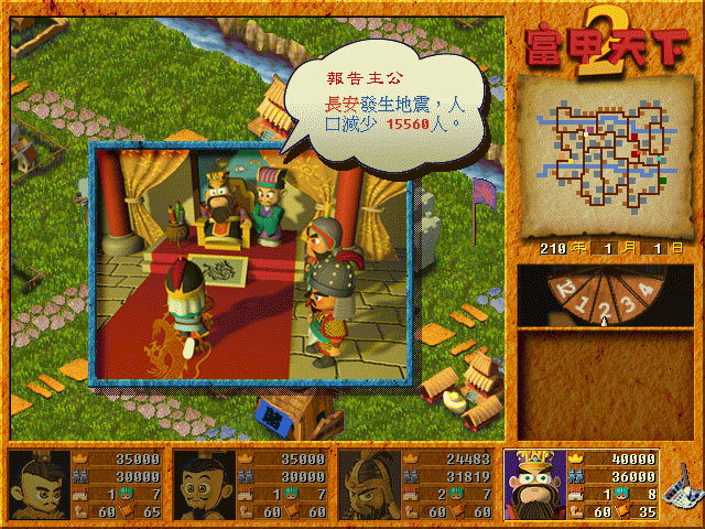 光谱 1998 年出品的大富翁游戏,以三国人物为主,共分为黄巾之乱、群雄割据、一统中原、富甲天下等四个时期,玩家可以任挑刘备、曹操、孙权、董卓等1~4人,游戏的主要的规则为先攻下所有城池者为胜,但若任一方身边无武将又付不出金钱,便宣告该方失败。游戏系利用武将与兵力相互攻防,可以买卖武器及计谋,兵力与金钱的增长是以领地为主,因此往往必须在驻防兵力与金钱的多寡中决择。